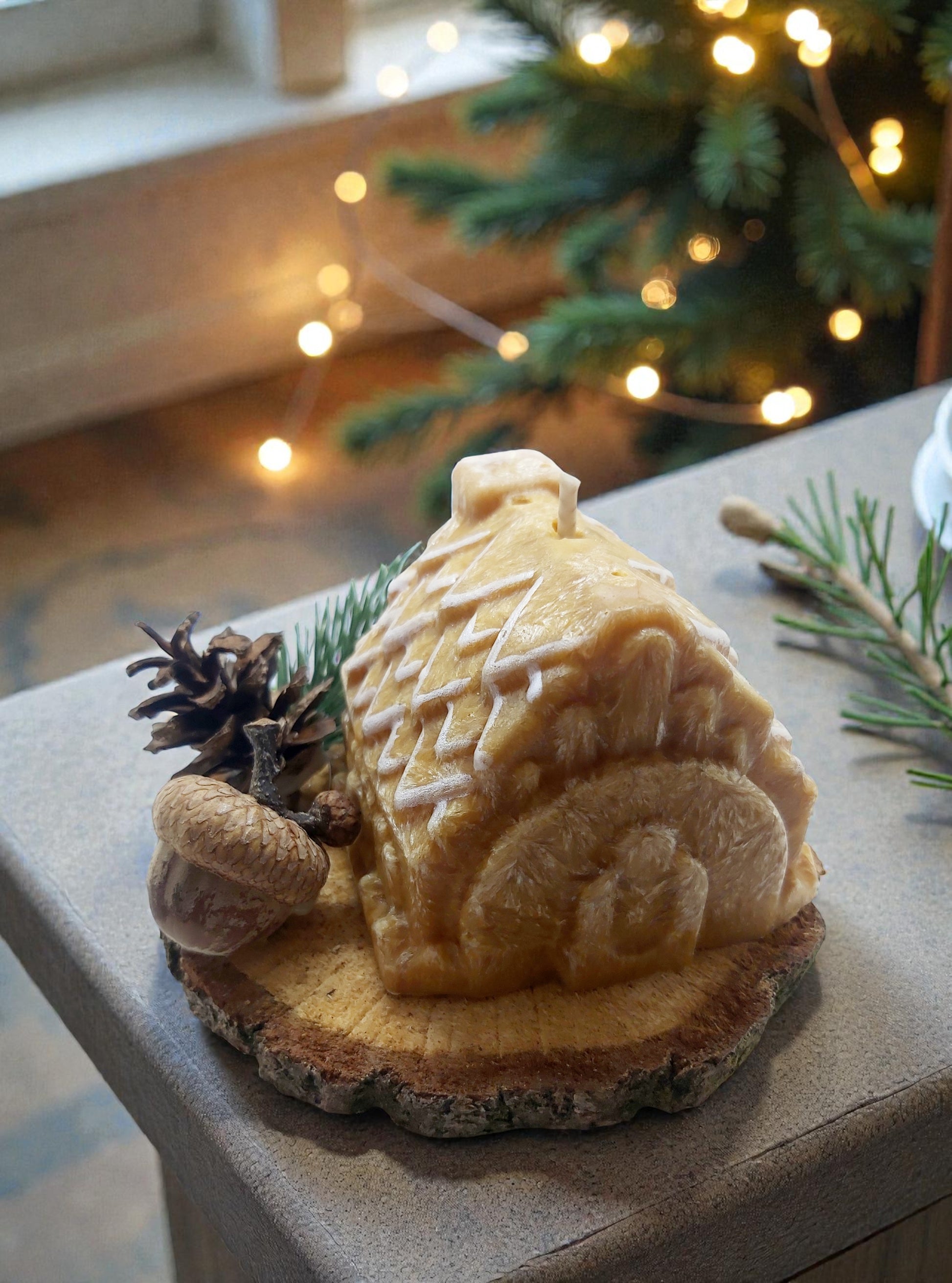 Questa candela a forma di casetta, in cera vegetale di palma, è priva di profumazione e decorata con dettagli dipinti a mano.